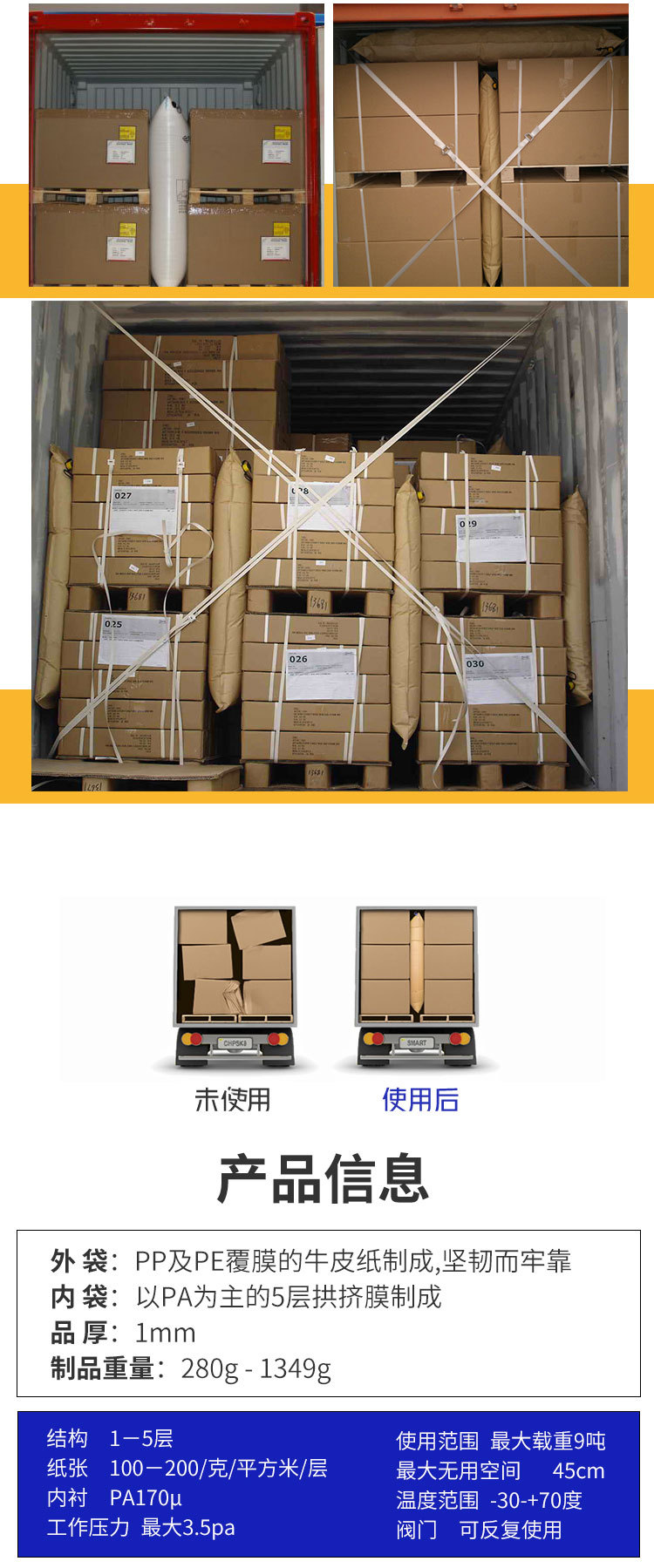 我們備有常用規(guī)格十幾種集裝箱專用填充氣袋。為客戶合理 / 合適的意見