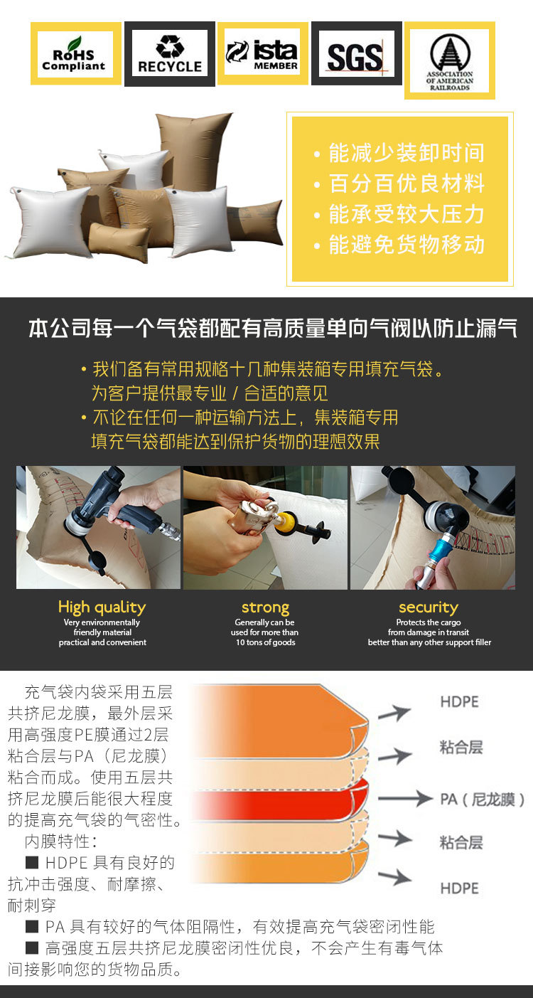 集裝箱充氣袋的外袋是用PP編織覆膜牛皮紙制成,堅韌而牢靠,內袋是以PA為主的5層拱擠尼龍薄膜制成。奧立充氣袋目前采用五層共擠尼龍膜(PA)制作內袋的廠家,而國內其它同類產品均采用的是LDPE材料制作內袋,無論強度、密閉性或抗刺穿性都遠不及尼龍膜。奧立集裝箱填充氣袋充氣嘴是特制的單向逆止閥,可有效防止充氣完畢后氣體外泄,而且它的特殊設計可保護氣袋不會在充氣時被損壞,并可減少操作人員受傷害的可能性,密閉牢靠,充氣袋可承受9噸以上的壓力。